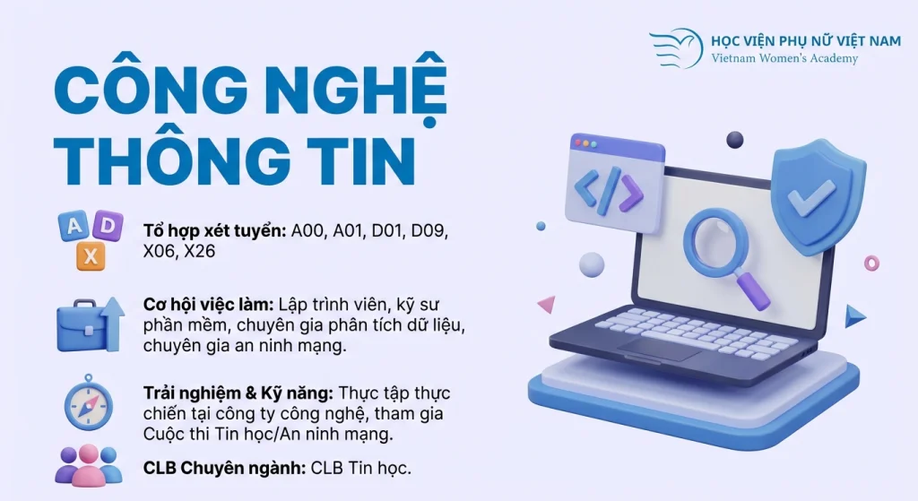 Trong một thế giới nơi công nghệ đang tái định hình mọi ngành nghề, việc lựa chọn CNTT đồng nghĩa với việc bước vào trung tâm của sự đổi mới. Với hai chương trình đào tạo chuyên sâu, đội ngũ giảng viên tâm huyết, cơ sở vật chất hiện đại và mạng lưới đối tác rộng mở, ngành Công nghệ thông tin tại Học viện Phụ nữ Việt Nam năm 2026 không chỉ là một lựa chọn học tập mà là điểm khởi đầu cho hành trình làm chủ tương lai số.