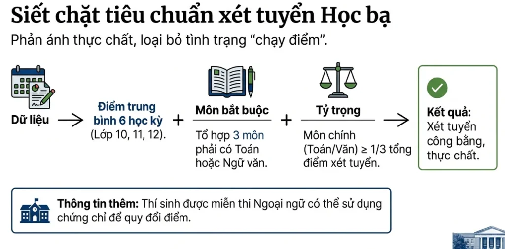 Một trong những thay đổi lớn và được nhiều trường lẫn thí sinh quan tâm là quy định xét tuyển bằng học bạ THPT. Nhằm hạn chế việc “làm đẹp hồ sơ”, quy chế mới yêu cầu: