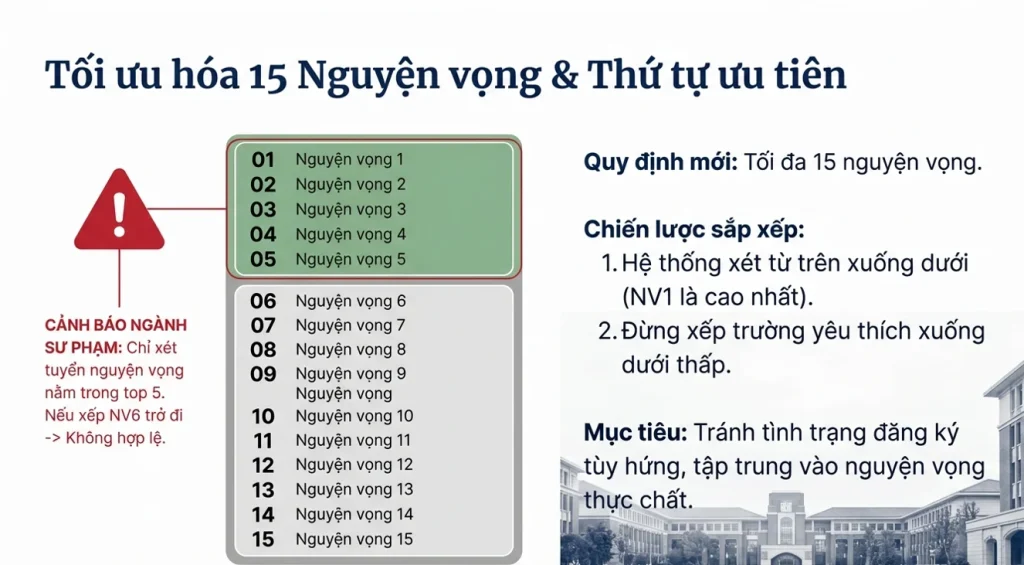 - Sắp xếp 15 nguyện vọng theo thứ tự ưu tiên dựa trên mức điểm dự kiến và sở thích nghề nghiệp.