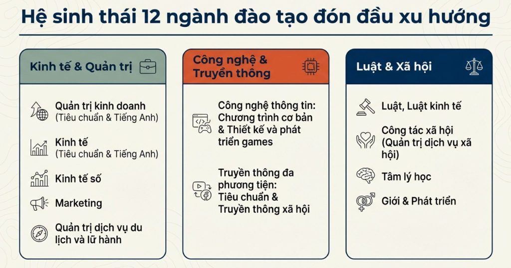 Những ngành đào tạo này được thiết kế nhằm đáp ứng nhu cầu thị trường lao động đa dạng và tạo điều kiện nghề nghiệp rộng mở cho người học, từ lĩnh vực công nghệ thông tin đến kinh tế, quản trị, xã hội và truyền thông.