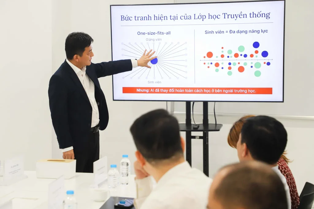 Chia sẻ tại buổi làm việc, PGS.TS Nguyễn Hữu Quỳnh cho biết, việc triển khai AI không chỉ dừng ở công cụ mà được xây dựng như một hệ sinh thái đồng bộ. Theo PGS.TS Nguyễn Hữu Quỳnh, dữ liệu giữ vai trò trung tâm trong mô hình này, giúp nhà trường phân tích hành vi học tập, tối ưu chương trình đào tạo và cá nhân hóa trải nghiệm người học: “Muốn AI phát huy hiệu quả, các trường phải triển khai đồng bộ từ hạ tầng công nghệ, nền tảng dữ liệu đến năng lực của đội ngũ. Nếu chỉ dừng ở từng ứng dụng đơn lẻ, hiệu quả sẽ rất hạn chế”.