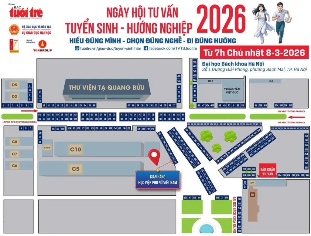 Nếu bạn đang tìm kiếm một ngành học phù hợp, muốn khám phá môi trường đại học năng động và nhận tư vấn trực tiếp từ giảng viên, sinh viên, hãy ghé thăm gian tư vấn của Học viện Phụ nữ Việt Nam. Tại đây, không chỉ có thông tin tuyển sinh, bạn còn có cơ hội trải nghiệm flycam, tham gia trò chơi, giao lưu cùng sinh viên, nhận nhiều phần quà hấp dẫn và check-in những góc ảnh “xịn sò” cùng bạn bè.