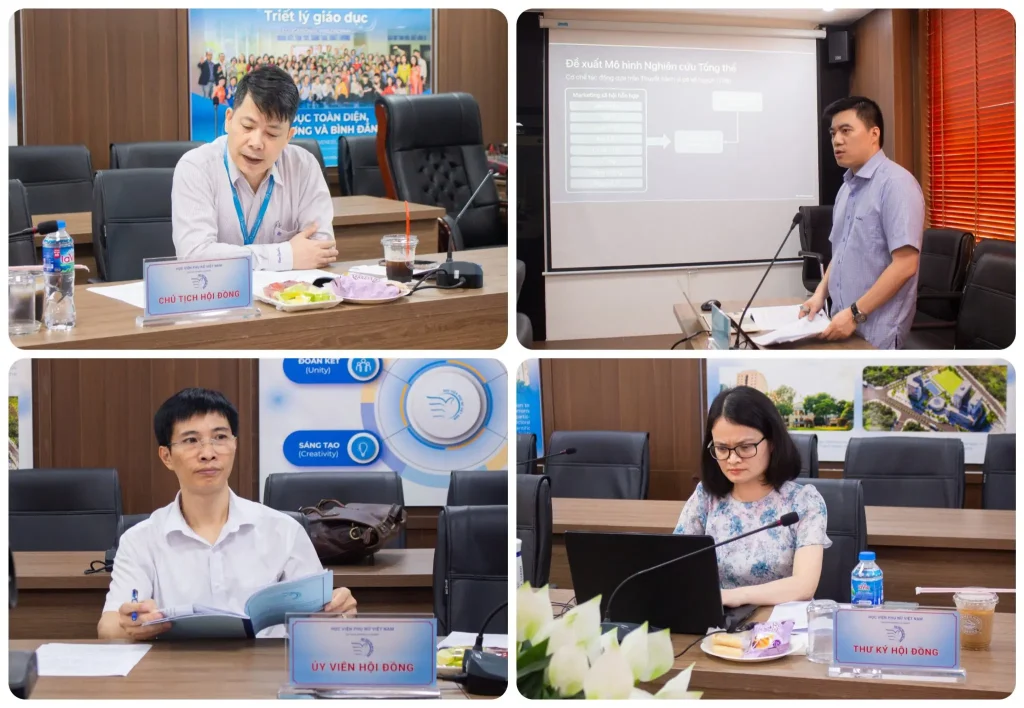 Thành phần hội đồng đánh giá chuyên đề “Cơ sở lý thuyết về Marketing xã hội và bắt nạt trực tuyến – Đề xuất mô hình nghiên cứu can thiệp” bao gồm: PGS, TS. Trần Quang Tiến – Giám đốc Học viện Phụ nữ Việt Nam (Chủ tịch), TS. Đoàn Thị Hà Thanh, Khoa Quản trị kinh doanh, Học viện Phụ nữ Việt Nam (Thư ký); PGS,TS. Lê Ba Phong – Trường Đại học Công nghiệp Hà Nội (Ủy viên).
