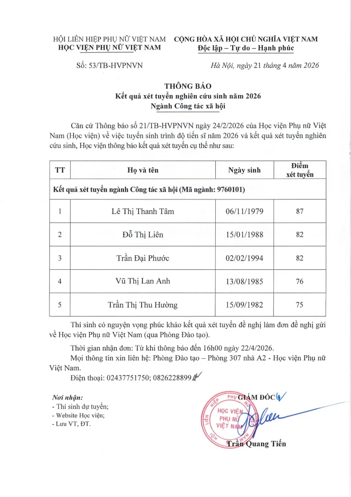 Học viện Phụ nữ Việt Nam công bố kết quả xét tuyển Nghiên cứu sinh ngành Công tác xã hội năm 2026.