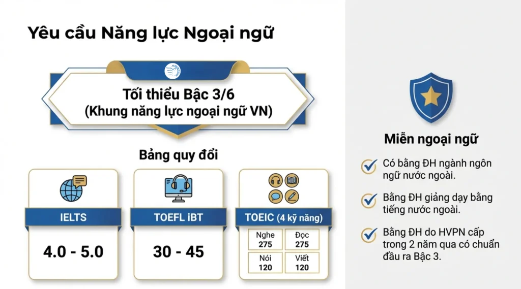 Năng lực ngoại ngữ là điều kiện bắt buộc để dự tuyển thạc sĩ tại Học viện. Ứng viên cần đạt trình độ từ Bậc 3 trở lên theo Khung năng lực ngoại ngữ 6 bậc dùng cho Việt Nam. Để tạo thuận lợi cho thí sinh, Học viện đưa ra bảng tham chiếu quy đổi từ các chứng chỉ quốc tế uy tín: