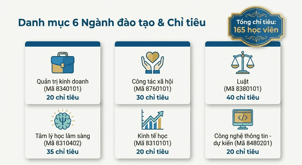 - Ngành Tâm lý học lâm sàng (Mã 8310402): 35 chỉ tiêu. Chương trình chú trọng vào kỹ năng chẩn đoán, trị liệu và hỗ trợ sức khỏe tinh thần.