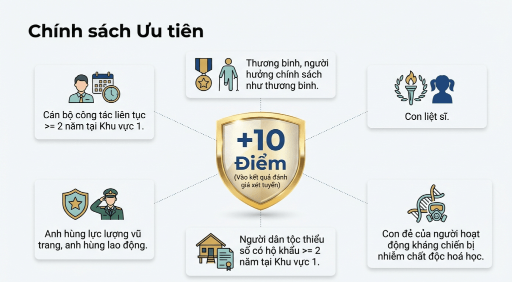 Học viện Phụ nữ Việt Nam luôn chú trọng đến tính công bằng và hỗ trợ các đối tượng đặc thù trong tuyển sinh. Theo quy định, những ứng viên thuộc đối tượng ưu tiên sẽ được cộng 10 điểm vào kết quả đánh giá xét tuyển. Các đối tượng được hưởng chính sách này bao gồm: